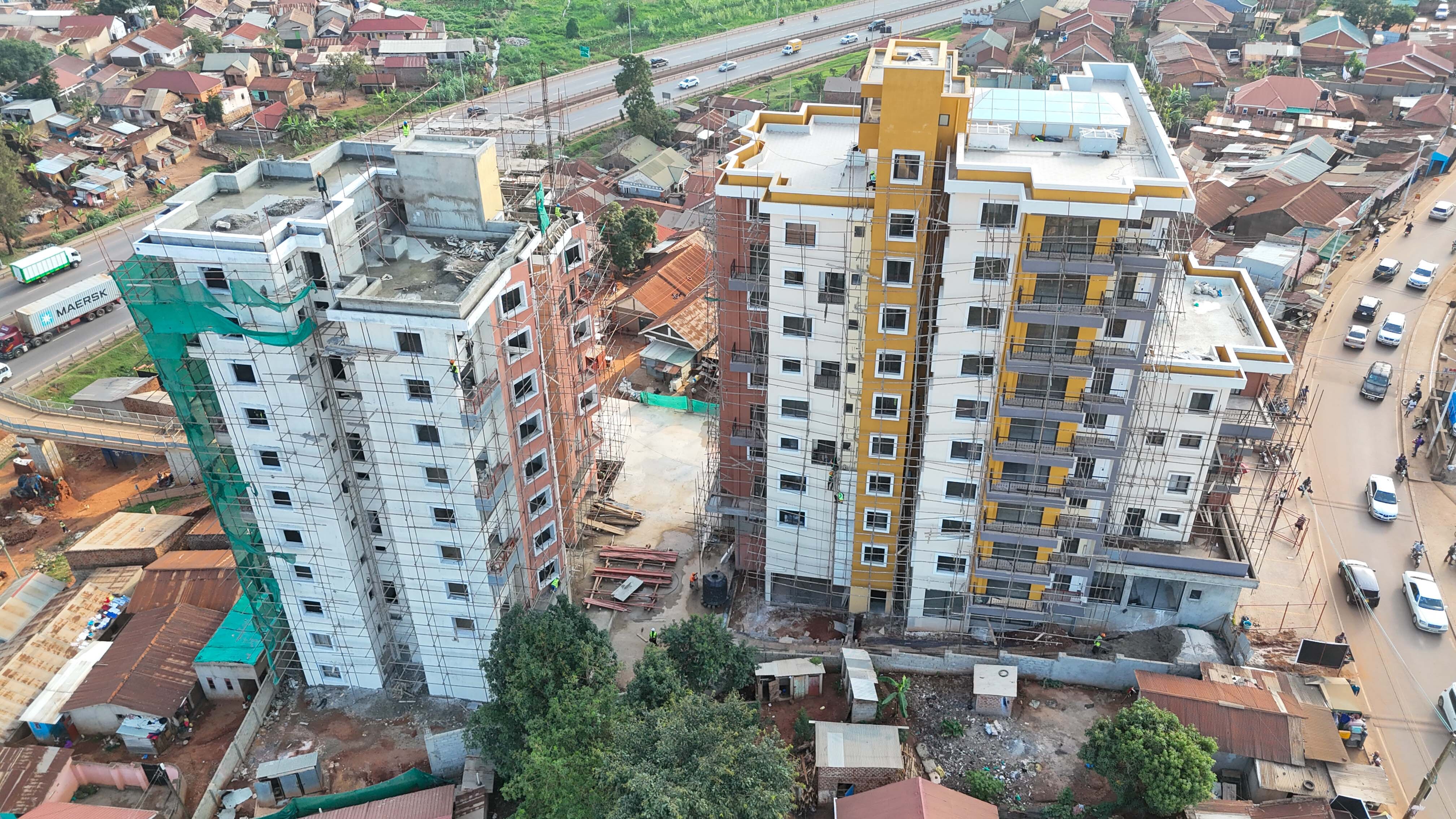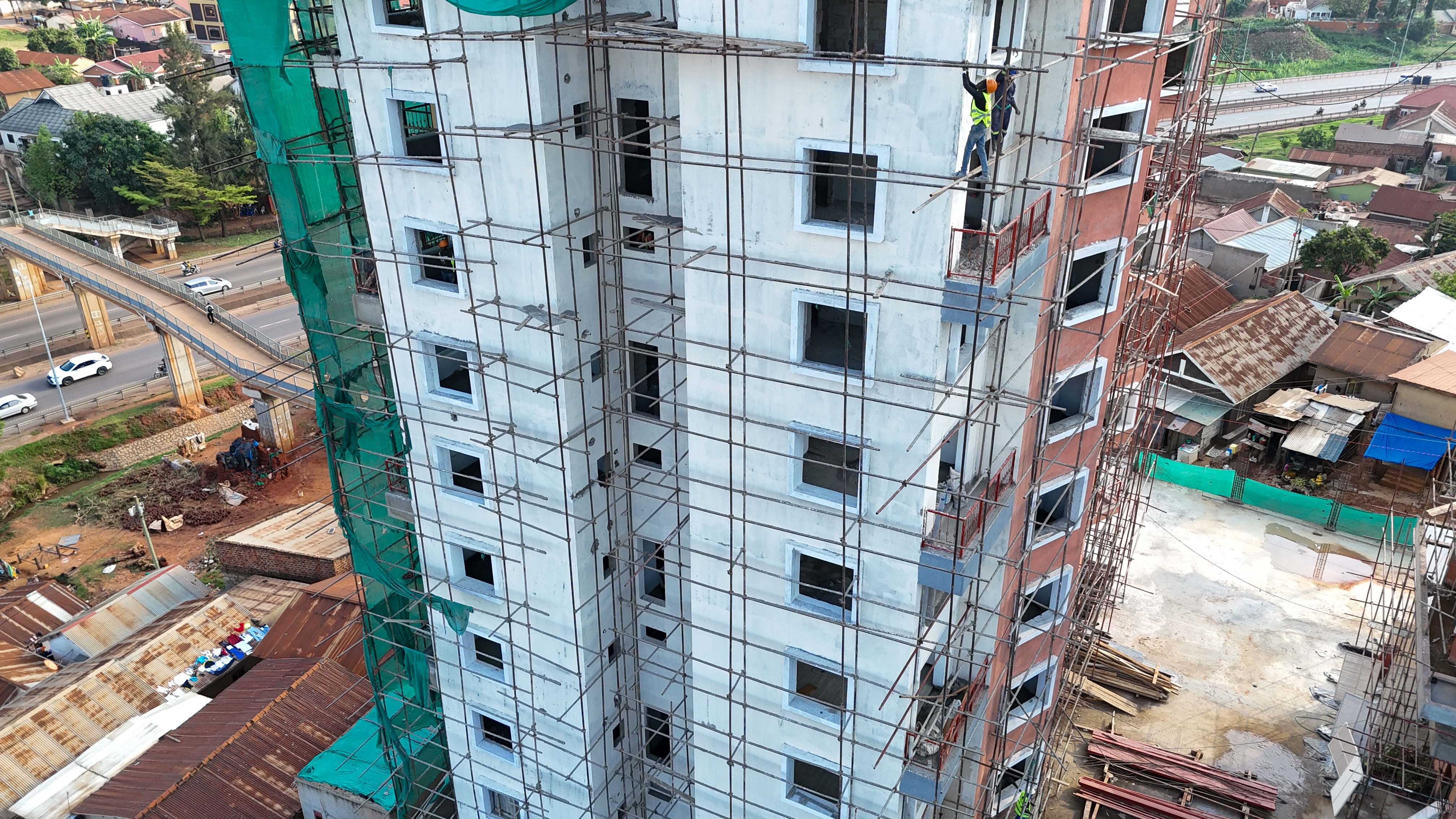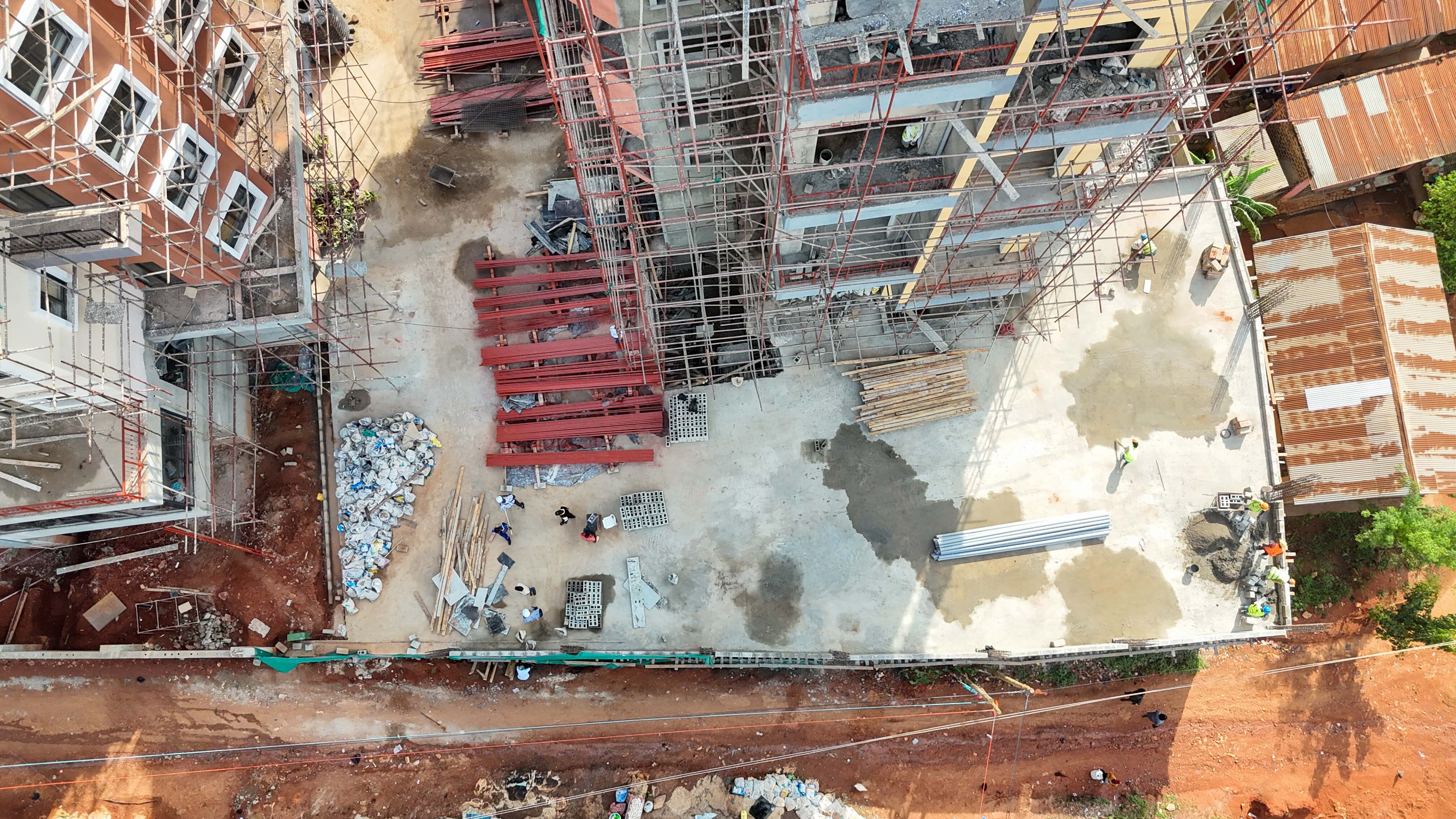 The construction project is moving forward steadily. Podium slab and terrace finishing work are complete, while exterior painting, internal finishes, and plot boundary development are currently in progress.
